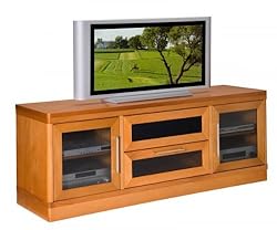 This TV console is well made and durably packaged to withstand Since it is rather heavy at 200 lbs, I would recommend paying extra to have it carried into your home as we This is especially true if it has to go up or down stairs and you don't have 2 family members with exceptionally strong backs ! As for the product itself, it arrived blemish free and met our expectations for the premium It has numerous cutouts in the back panel to facilitate wire management and is more than strong enough to handle our 58" plasma The inside shelves are adjustable and the glass fronts on the doors do not interfere with remote control On the negative side is the price and the lack of casters which I plan to install Other than that, it is a fine piece of furniture for anyone looking for something a cut above the
